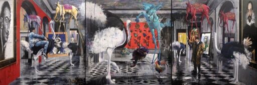 “In un mondo dominato dall’ossessione per l’immagine e dal gusto per l’iperbole, la figura di Salvador Dalí appare oggi incredibilmente attuale”, scrive il curatore Nino Florenzano nella presentazione. “Nella sua lunga carriera, l’artista catalano ha anticipato il concetto di brand artistico: la costruzione consapevole di un’immagine pubblica spettacolare, teatrale e immediatamente riconoscibile. All’Eden House of Art, le grandi tele di Angelo Accardi si aprono come varchi in uno scenario daliniano, ricostruito con un trompe-l’œil che avvolge le pareti dello spazio. L’artista dà vita a un racconto che si muove tra ironia e vertigine visiva, dove l’omaggio si intreccia alla dissacrazione”.