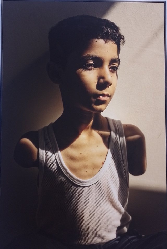 “Mahmoud Ajjour, Aged Nine”, il titolo della straziante e bellissima fotografia, lo sguardo e il volto di Mahmoud dicono più di tante parole, spesso retoriche e vacue. La sua storia racconta il male, violenze, atrocità della guerra, dolore e sofferenze di un corpo violato, braccia amputate e mutilate, un’anima violentata e “mutilata”anch’essa, ma racconta anche il bene, la vita che sopravvive e vince nonostante tutto, e l’amore, l’altruismo, il coraggio, di un bambino che cercava di mettersi in salvo e soprattutto di aiutare gli altri. Mahmoud stava fuggendo nel corso di un attacco aereo israeliano a Gaza, ma il suo pensiero era rivolto ai suoi cari, il tempo di voltarsi per incitare e incoraggiare la sua famiglia a muoversi celermente, che la violenza lo aveva falciato, un’esplosione gli aveva tranciato un braccio e mutilato anche l’altro. Non sapremo mai cosa Mahmoud stesse pensando o provando quando è stato ritratto da Samar Abu Elouf, sappiamo che la sua vita è cambiata, perché è stata stravolta quel giorno terribile, possiamo soltanto augurargli una vita nuova che gli doni tutto ciò che merita e magari anche due protesi per le sue braccia, e una rinnovata fiducia negli esseri umani, una rinascita fatta di speranze, sogni, giochi, sorrisi e risate, amore, pace. Dopo un complesso intervento chirurgico e molti mesi di cure, Mahmoud sta imparando ad usare i piedi per scrivere, per giocare con il telefono e per aprire le porte, ma il suo desiderio più grande è quello di potere un bel giorno avere delle protesi per tornare a vivere come i suoi coetanei. In base alle stime delle Nazioni Unite, a Gaza, nel solo dicembre 2024, è stato registrato il numero più consistente di bambini amputati nell’intero mondo.